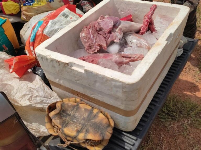 Os policiais realizavam operação, juntamente com profissionais do ICMBio, quando avistaram um quadriciclo e uma caminhonete em um ramal que dá acesso a uma unidade de conservação. Os militares realizaram uma abordagem aos veículos e durante as buscas foi encontrado um isopor contendo carne de animais silvestres, além de um quelônio (jabuti) vivo. Indagados sobre a procedência dos animais, os envolvidos, seis pessoas no total, afirmaram que passaram o final de semana em uma colocação próximo a uma unidade de conservação e lá os pegaram. Perguntados se possuíam arma de fogo, responderem que possuíam seis armas de fogo (espingardas), e somente uma com registro.
